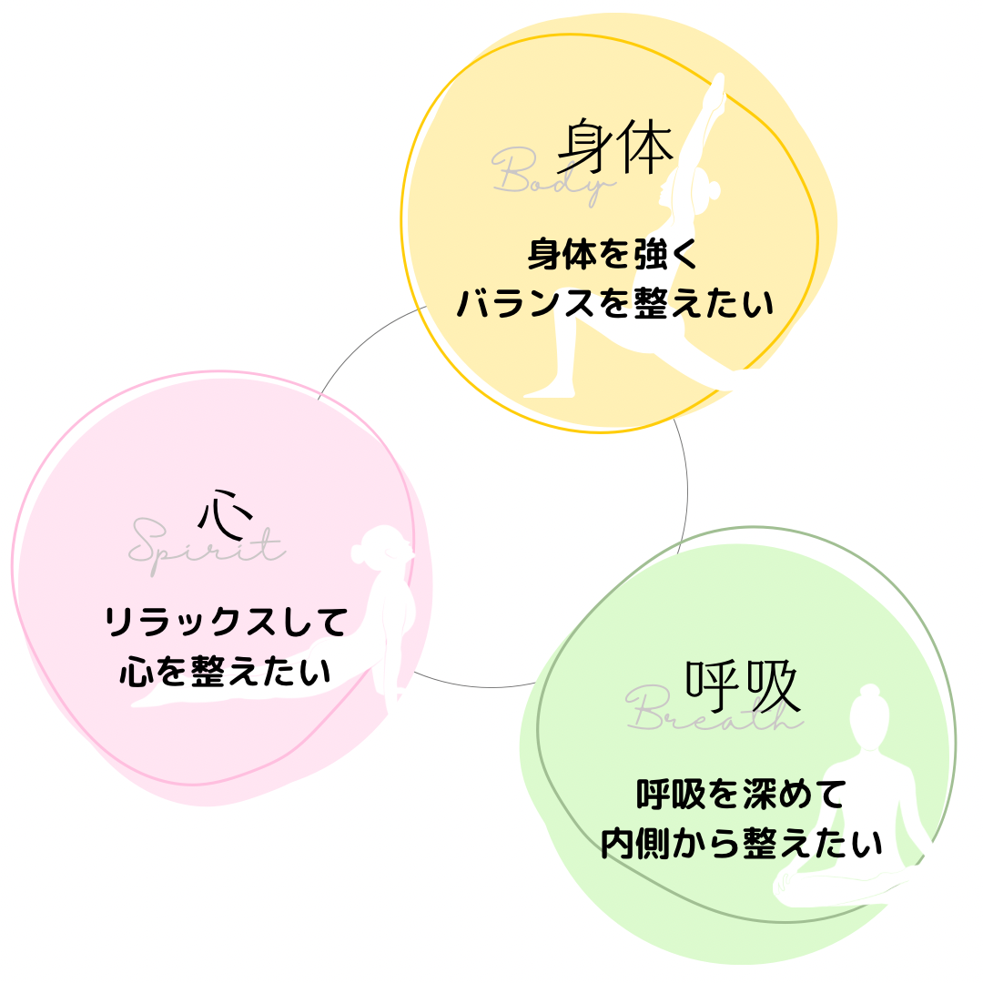 筋肉の使い方を学び身体のバランスを調整するヨガ、呼吸を深めゆったりとした動きで身体と心の柔軟性を高めるハタヨガ、呼吸と指先から心身を整える瞑想を開催しています。