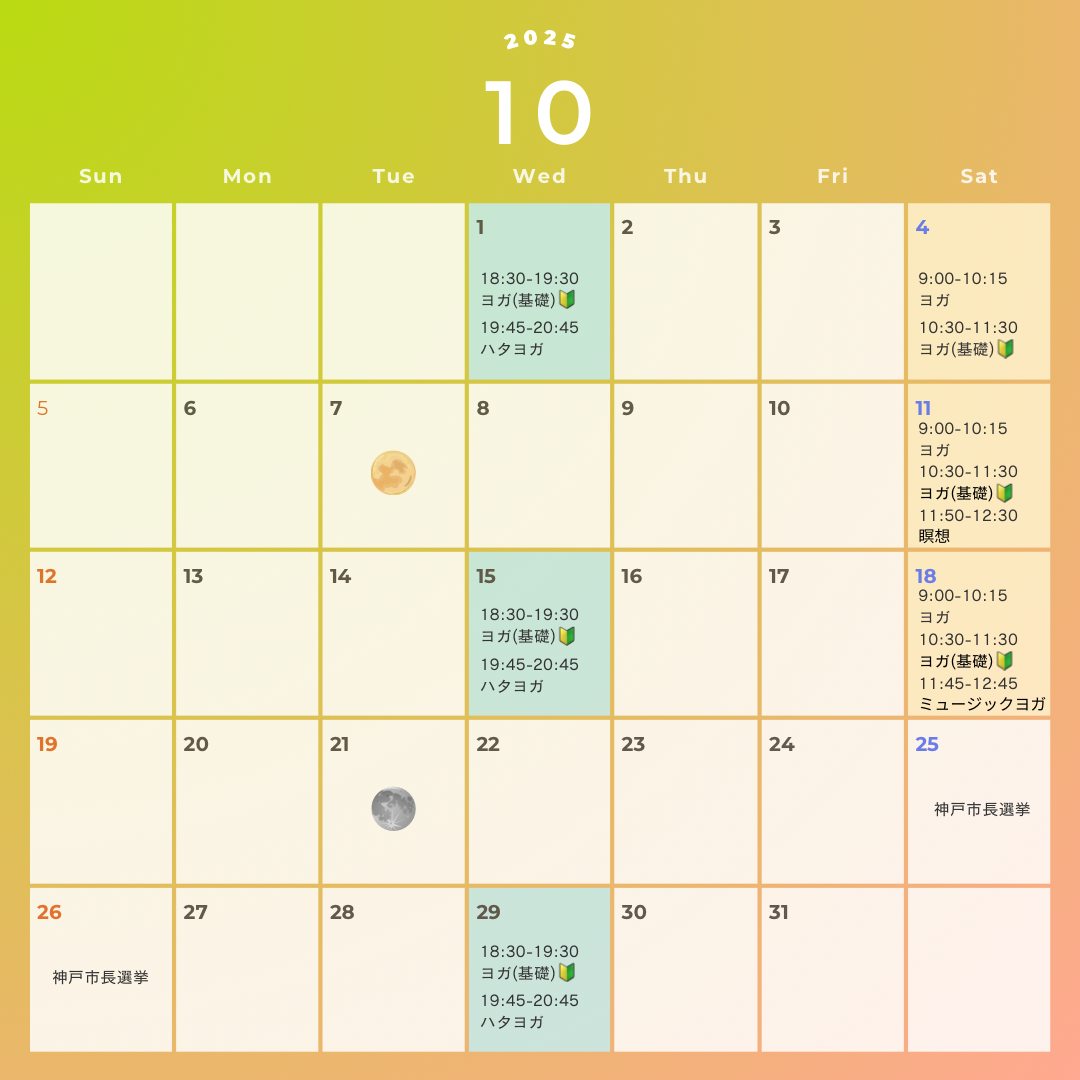 10月のスケジュールの変更についてお知らせします。 18日(土)11:45〜12:45ミュージックヨガご興味がありましたらぜひご参加くださいませ。 25日(土)終日神戸市市… -