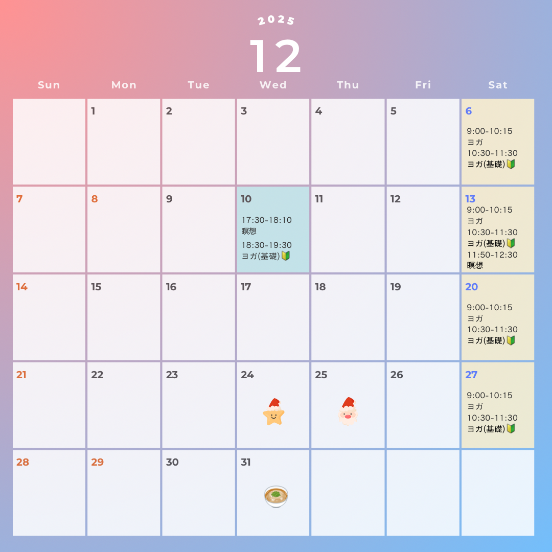 12月のスケジュールです、よろしくお願いします。 水曜クラスの時間が変更になります。17:30〜に瞑想18:30〜はそのままです☺️ 土曜クラスはいつも通り… -